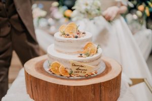 秋らしい色味のフルーツの乗ったウェディングケーキに